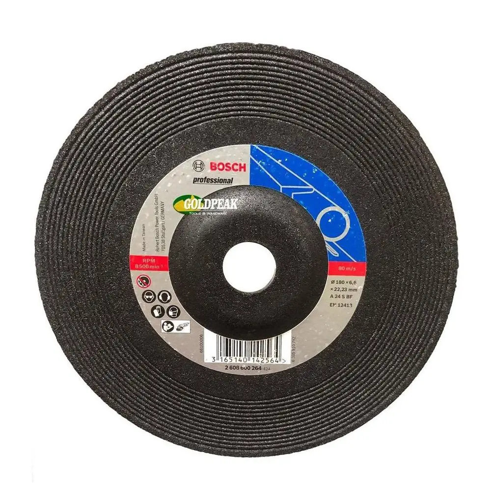 Bosch Grinding Disc 7″ (180 x 6.6 x 22.23mm), A24 S BF গ্রেড, মেটাল ঘষার জন্য উপযোগী। EN 12413 সনদপ্রাপ্ত ডিস্কটি ওয়েল্ড ফিনিশিং, ধাতব প্রক্রিয়াকরণ ও হেভি গ্রাইন্ডিংয়ের জন্য আদর্শ।