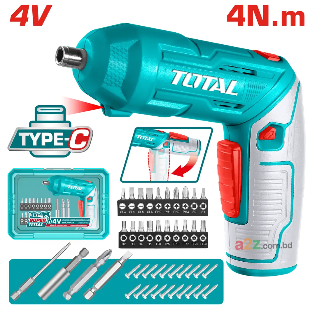 Cordless Screwdriver 4V (Model: TSDLI04425) হলো একটি ছোট, হালকা এবং ব্যবহারবান্ধব পাওয়ার টুল যা ঘরের ছোটখাটো মেরামত, DIY কাজ এবং বিভিন্ন স্ক্রু টাইট বা লুজ করার কাজে ব্যবহার করা যায়। এই Cordless Screwdriver আধুনিক ডিজাইন ও কার্যকর পারফরম্যান্সের কারণে ঘরোয়া ব্যবহারকারী থেকে শুরু করে টেকনিশিয়ান—সবার জন্যই উপযোগী।