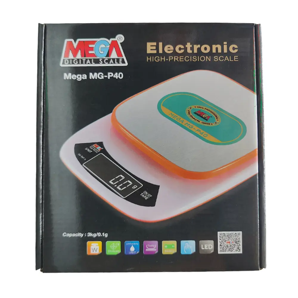 MEGA Digital Weight Scale 3kg (Model: MG-P40) হলো একটি ছোট ও নির্ভুল ডিজিটাল ওজন পরিমাপক যন্ত্র, যা সর্বোচ্চ ৩ কেজি পর্যন্ত ওজন পরিমাপ করতে সক্ষম। এটি বিশেষভাবে রান্নাঘর, অফিস, ল্যাবরেটরি, বা হালকা ওজনের পণ্য ও সামগ্রী পরিমাপের জন্য ডিজাইন করা হয়েছে। компакт ও আধুনিক ডিজাইন সহ এটি সহজে বহনযোগ্য এবং ব্যবহার উপযোগী।