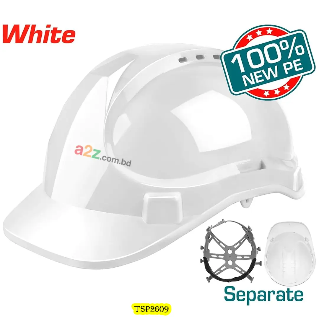 TSP2604 Safety Helmet একই হেভি ডিউটি স্ট্রাকচারে তৈরি, যেখানে র্যাচেট অ্যাডজাস্টমেন্ট ও শক্তিশালী V-টাইপ রিইনফোর্সমেন্ট রয়েছে।