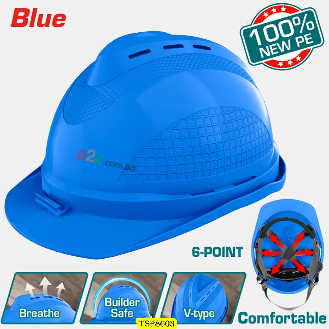 TSP8601 একটি প্রিমিয়াম গ্রেড সেফটি হেলমেট, যা 100% New PE মেটেরিয়াল দিয়ে তৈরি। এতে রয়েছে 6 Point Suspension, যা দীর্ঘ সময় ব্যবহারে আরও বেশি স্থিতিশীলতা ও আরাম নিশ্চিত করে।