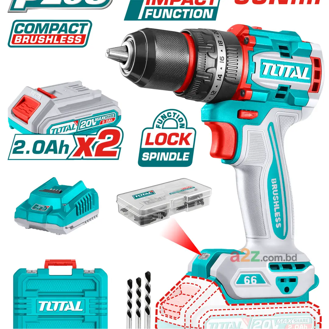 ২০ভি TOTAL TCKLI20277 হল একটি ব্রাশলেস, দুই-উপকরণের কর্ডলেস কিট: কম্প্যাক্ট ইমপ্যাক্ট ড্রিল ও ইমপ্যাক্ট ড্রাইভার, দুইটি 2.0Ah ব্যাটারি, চার্জার এবং পুরো একসেসরিজ সেট সহ — দীর্ঘস্থায়ী পারফরম্যান্স ও উচ্চ ট্রর্ক।
