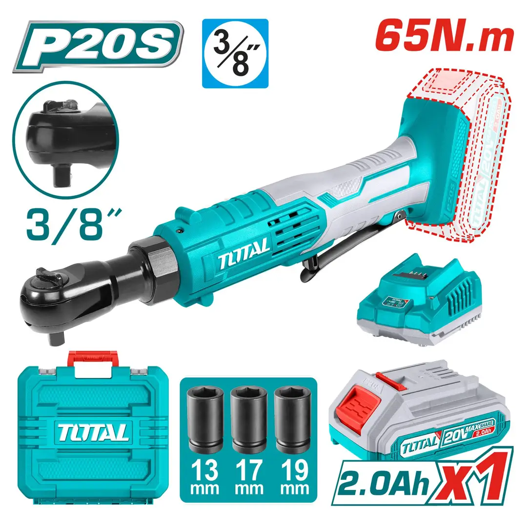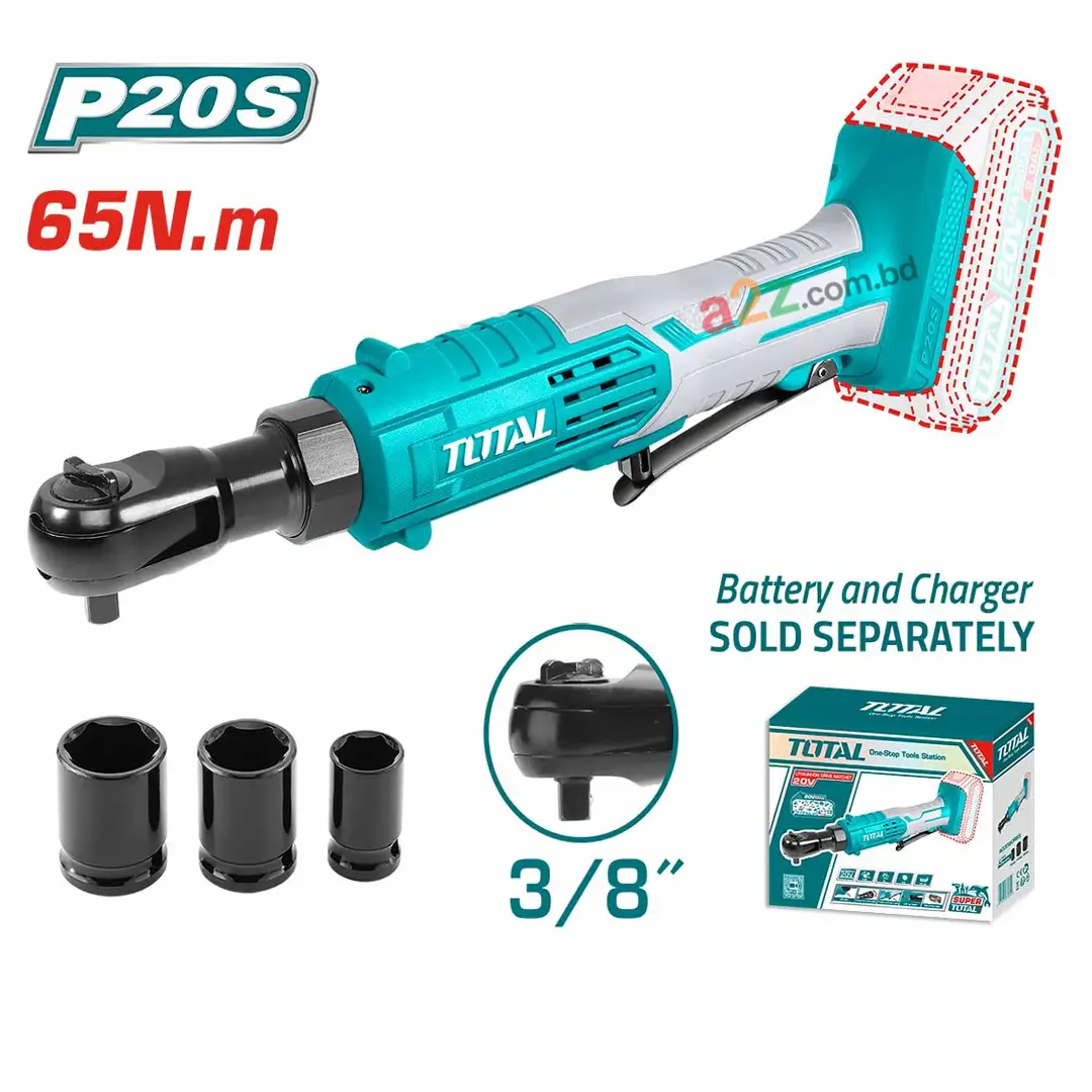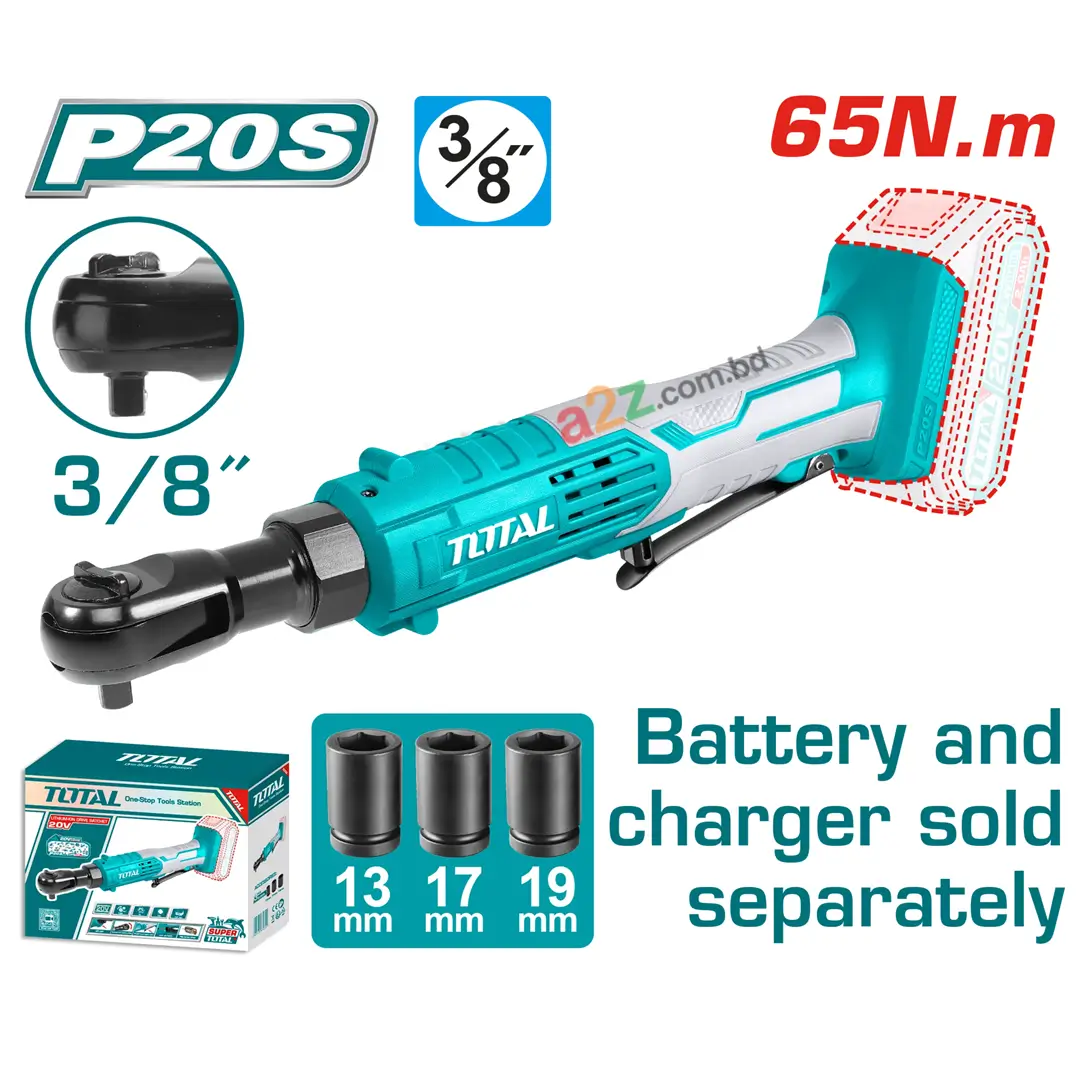 20V Total লিথিয়াম-ion কর্ডলেস ড্রাইভ র্যাচেট (TDRLI2060151) — 65Nm টর্ক, ৩/৮″ স্কয়ার ড্রাইভ, ০-২৫০rpm স্পিড, এবং ৩টি সকেট (13/17/19 মিমি)। ব্যাটারি ও চার্জার আলাদাভাবে বিক্রি হয়।