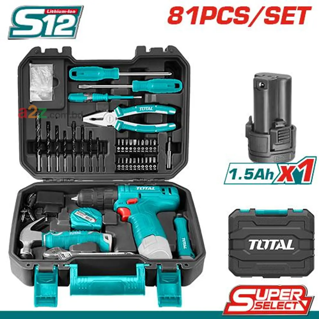 TOTAL THKTHP1081 12V লি-আয়ন ৭১ পিস হাউসহোল্ড টুলস সেট | কর্ডলেস ড্রিল + স্ক্রুড্রাইভার + হাতকাজের টুলস এক সেটে