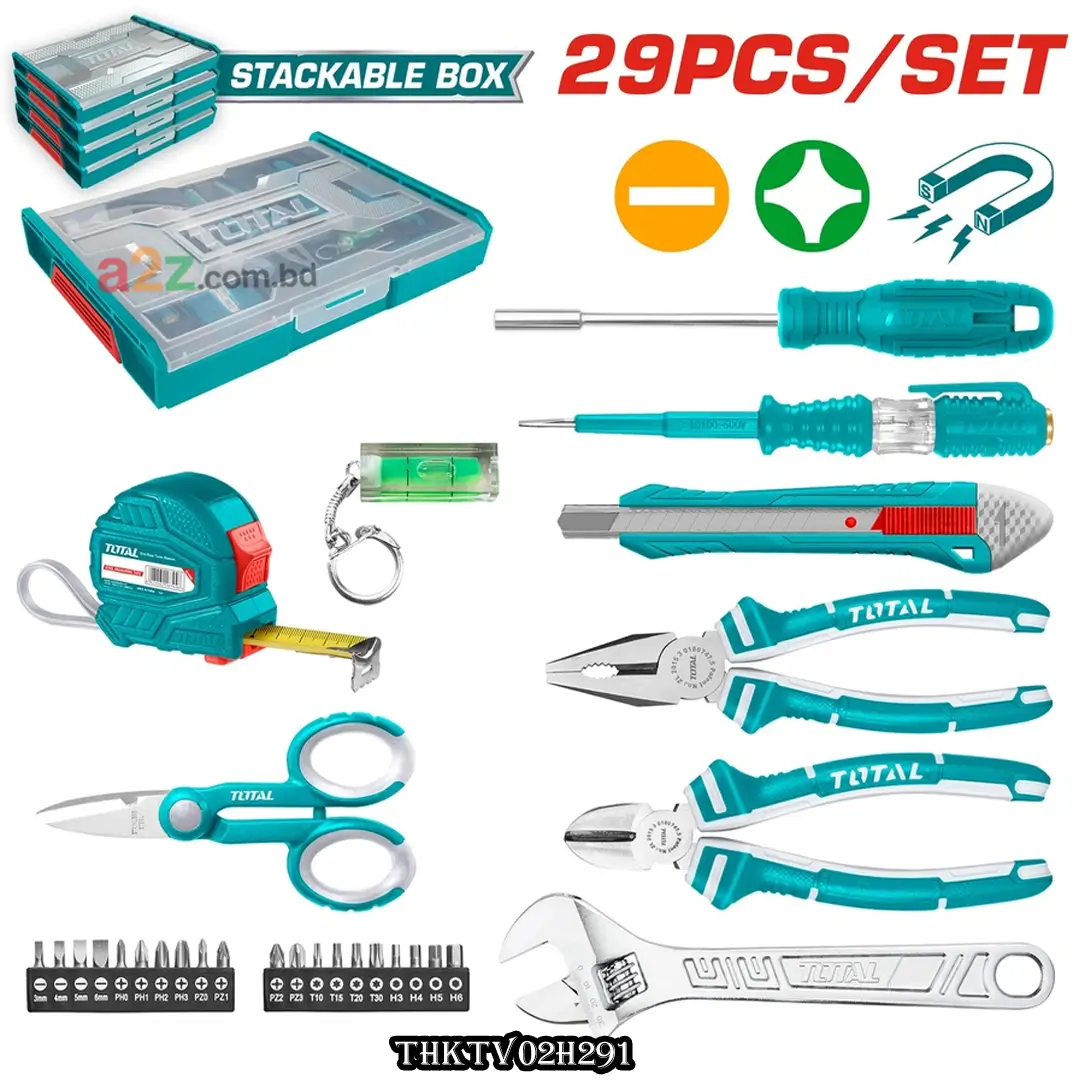 THKTV02H291 29 পিস হাউসহোল্ড টুলস সেট হলো একটি সম্পূর্ণ, প্রিমিয়াম মানের টুল কিট, যা হোম DIY, মেরামত ও সাধারণ হাউসহোল্ড কাজের জন্য আদর্শ। এই বহুমুখী সেটে রয়েছে প্রয়োজনীয় হ্যান্ড টুলস, স্ক্রু ড্রাইভার বিটস এবং মেজারিং টুলস, যা স্ট্যাকেবল প্লাস্টিক বক্সে সংরক্ষিত, ফলে এটি বহন ও সংরক্ষণে সুবিধাজনক।