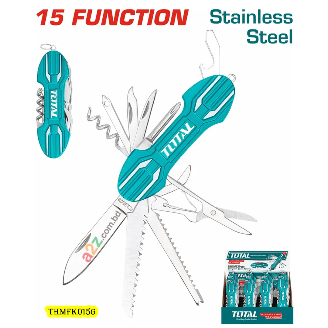 THMFK0156 হলো একটি Multi-Function Knife, যা 15টি ফাংশন একসাথে সংযুক্ত করে এবং হোম, ক্যাম্পিং, ট্রাভেল ও DIY কাজে বিশেষভাবে উপযুক্ত। এর Strong Aluminium Handle টেকসই ও আরামদায়ক, দীর্ঘ সময় ব্যবহারের পরও স্থায়ী।