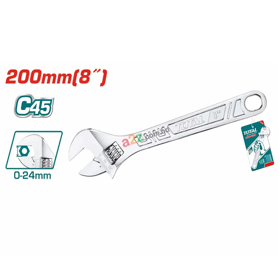 TOTAL THT101083 একটি 8 ইঞ্চি (200 মিমি) দৈর্ঘ্যবিশিষ্ট অ্যাজাস্টেবল রেঞ্চ যা হ্যান্ডি‑ম্যান, গ্যারেজ মেকানিকস এবং হোম ইউজারদের জন্য আদর্শ। এতে রয়েছে 0‑24 মিমি পর্যন্ত খোলা যেতে পারে এমন জ কী ক্ল্যাম্প সাইজ। উচ্চমানের হালকা অ্যালয় স্টীল বা ক্রোম ফিনিশযুক্ত উপাদানে নির্মিত, যা জং ও ঘর্ষণ প্রতিরোধে কার্যকর।