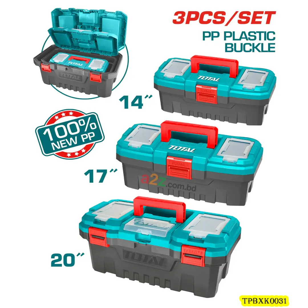 TPBXK0031 3 Pcs Plastic Tool Box Set – 14″, 17″ ও 20″ সাইজ, PP মেটেরিয়াল, শক্ত হ্যান্ডেল ও মাল্টিপল স্টোরেজ এরিয়া সহ।