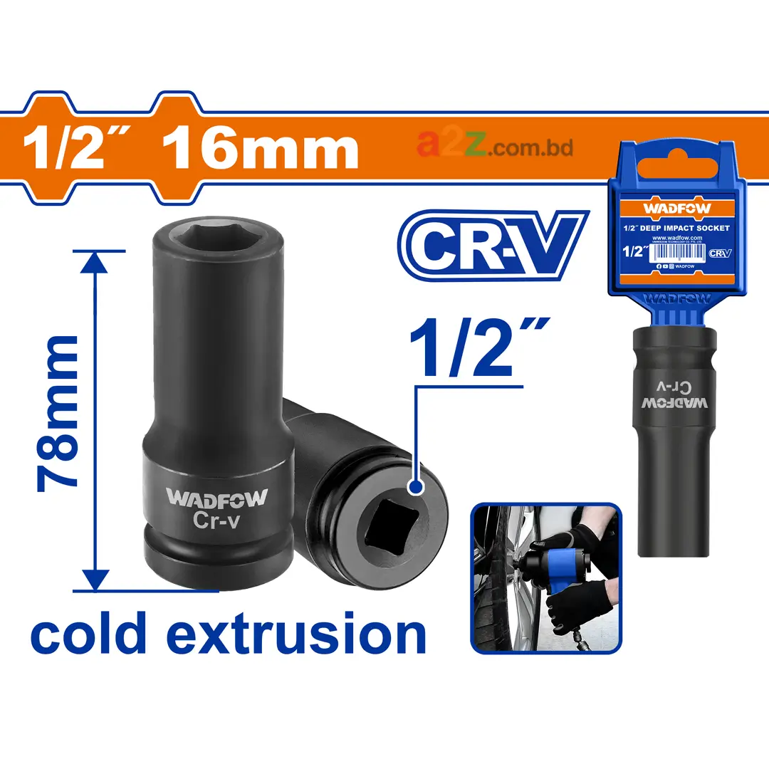WMS3216 — 1/2″ Deep Impact Socket, 16mm × 78mm, 50BV30 Cr-V, Heat Treated, Cold-Extruded, Impact-Rated, Plastic Hanger Packaging।